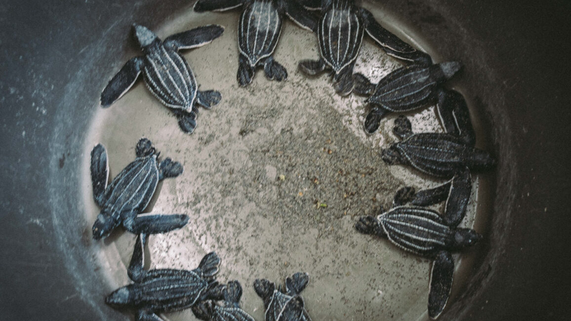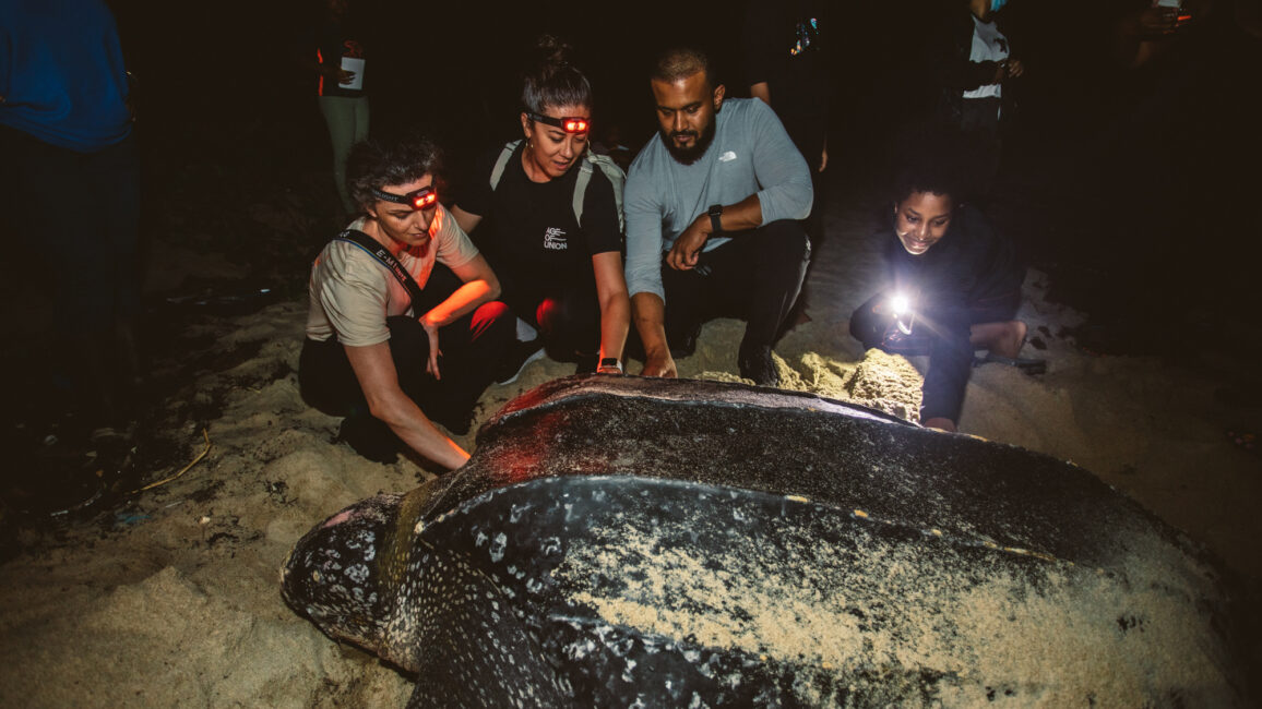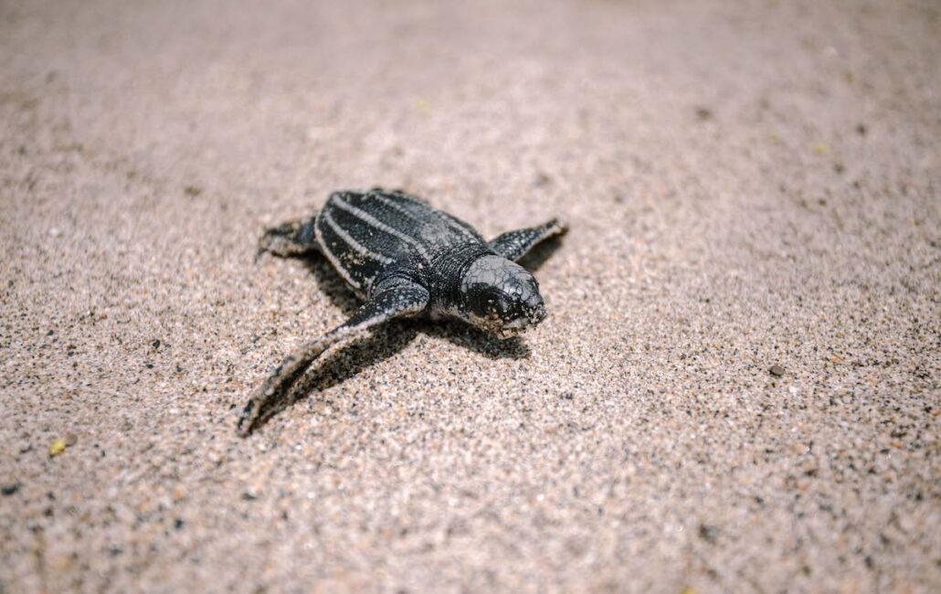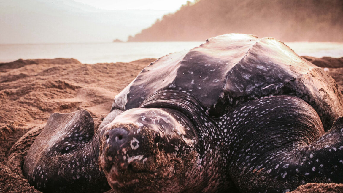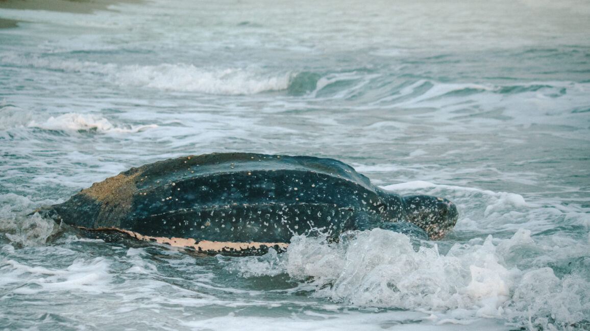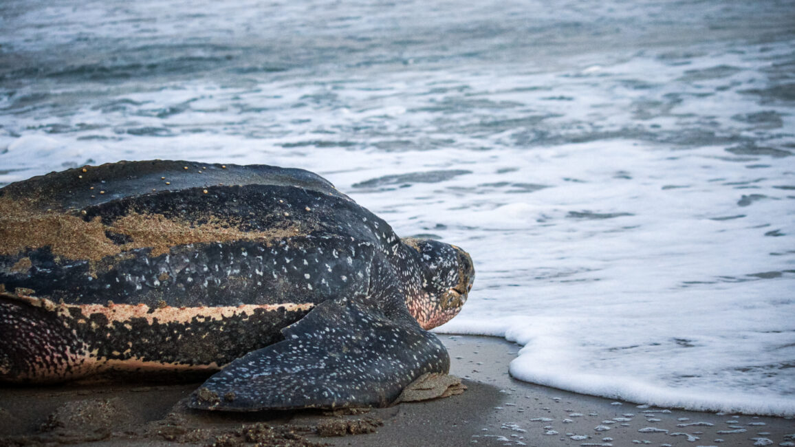 Leatherback turtles are threatened by pollution and the side effects of climate change, such as sargassum, which prevents them from reaching the beach to lay their eggs or for newborn baby turtles to reach the ocean.